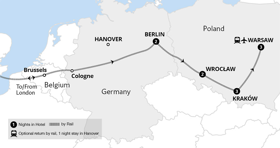 Embark on an exploration of Poland on a rail journey from London to Warsaw. Stop off in Berlin to discover the German capital's main landmarks before arriving in medieval Wrocław, where timeless squares are lined with colourful buildings. Continuing to Kraków, uncover a city showcasing Polish history from its stunning Old Town to the emotive...